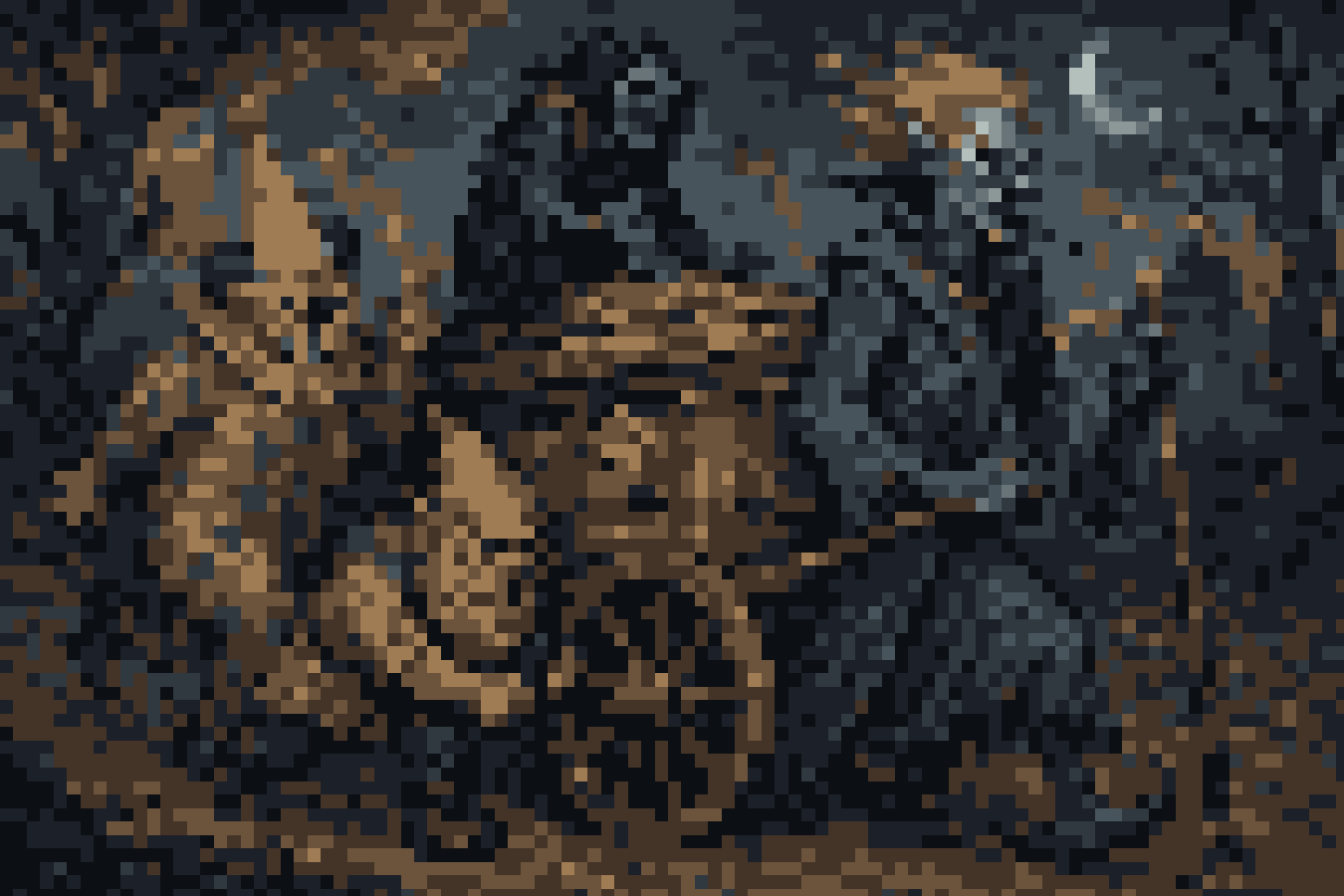 While you remain fixed in the chair, The Contortionist unravels a few links in his limbs. His arcing limps draw down from the top shelf a bottle of glazed fir needles, a pouch of knuckle dust, and two slivers of moose antler. He sets them on a tiny, stone-topped workspace, beside the bubbling vat.