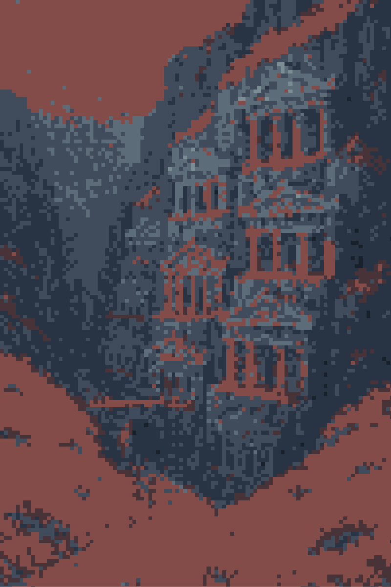 Originally the white marble facades which open onto the wide sandstone terraces were tohmbs. Layer after layer. Tohmb after tohmb. Descending down into the unplumbed trough. Over many Times, the upper tohmbs were repurposed for living space. The town grew, and crept down, though it never plunged beyond at least the echo of refracted sunlight.
