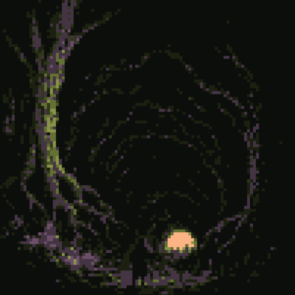 You may have escaped the pulpy hall of that log, but surely it is not without cost. No trunk here comes to your memory. Fool. You have left Her alone. In the dark. Do you call out? Break your silent vow? It would do no good. How could she hear you, or you her, in this pounding rain? The canopy gives strangely little cover, the pellets seeming to fall horizontal. Even now you let your cold, soaked wool distract you. Why have you not looked for the light of her spear? Is it because you fear the other lights in the wood? Are you afraid that another beautiful music will dazzle your will? Beautiful, but surely an evil twinkling.