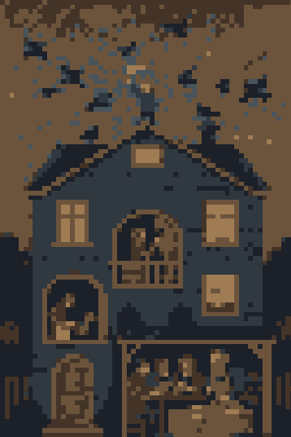 The Kustodevite sect of mancers present the soul as a lodging house. A painted lodging house, with many floors, many rooms, many windows and doors. The house begins with the boy on the roof, waving a flag at the pigeons in the sky. It descends, through rooms and persons: the husband and wife dining on the balcony, the maid dusting curtains, the three old friends playing cards at a table on the porch. The lodge ends at the bottom, with the coffin-maker in the cellar.
