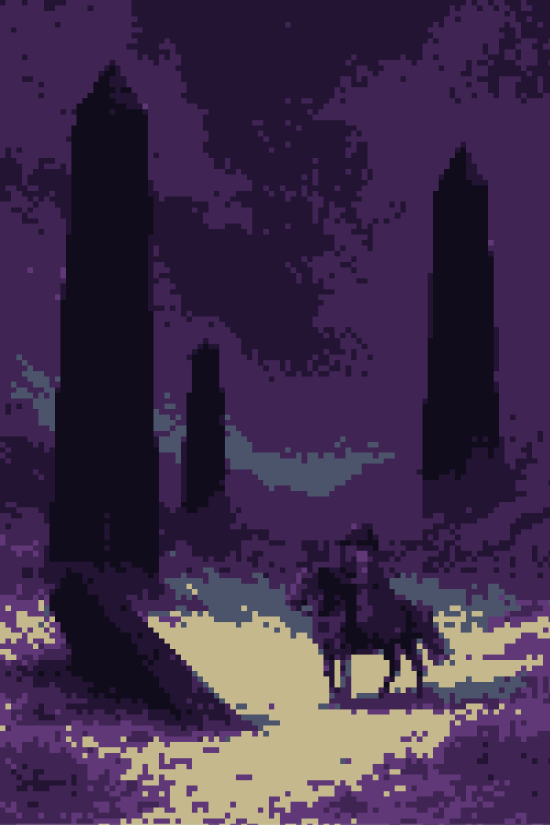You pass between six black obelisks. Five stand upright, five times the height of a man. One has toppled on its side. These are the border of your Lady’s world; no lake men dwell beyond. Many miles lie between you and the next farm or village. What shelter is to be had will be found under canvas, in caves - must be claimed by the bite of your Polished Steel Longsword.